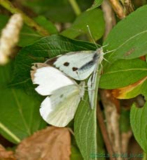 Probably the only picture today - This pair of Large Whites were clearly preparing to mate when I first spotted them on the other side of the pond in the early afternoon. They stayed just long enough for me to dash into the house, grab my camera, and take this one picture of the male making a close approach before the pair spiraled out of sight over the hedge into my neighbour's garden. Notice the lack of spots on the upper surface of the male's rather worn forewing, and the female's abdomen held high as she releases pheromones.