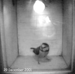 In the bottom right corner you may just make out a large spider. This was completely ignored as the Great Tit spent about a minute in there. Twenty minutes later and the Starlings managed to empty most of the water out of the birdbath as they queued up for their morning splash! Around noon I spotted a Wren making a brief visit. Shortly afterwards a Blue Tit made a number of prolonged visits to the entrance of the bird box, without entering it. 29 December - Snow for the first time this Winter - well, just about! You could use the fingers of one hand to count the flakes/minute falling at 9.30am, and with the temperature above freezing there is nothing to photograph.