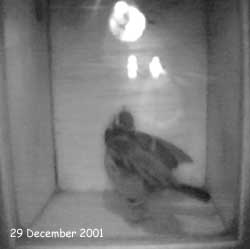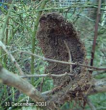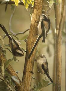 Here are images of two. Each one is 2.5 - 3cm long. If you click on the picture to see a larger version, you will see that the left hand caterpillar shows the three pairs of thoracic legs, four pairs of prolegs and claspers that distinguish it as a caterpillar rather than a saw-fly larva. My caterpillar book failed again to give me an identification, but a helpful member of the natural-history newsgroup (Liz) has come up with Cabbage Moth (Mamestra brassicae). As the name suggests, they can be serious pests of cabbages, feeding on almost any low-growing herbaceous plant, but also some deciduous shrubs and trees (including Oak and Birch). It seems that milder conditions encourages them to produce more than one generation a year. 4 December - I have not had any photo-opportunities these last couple of days. This morning I found three spots around the far end of the pond where a small amount of digging has been done, in the area where the caterpillars were found. I suspect the culprit is a fox, so I have set up a CCTV camera to record activity through some of tonight just in case there is a return visit. Very little else has happened of note over the last couple of days. The sparrows, blackbirds, blue tits, collared doves and the robin can be seen through much of the day. A few starlings will spend some time here and the Dunnock seems to be a regular morning visitor now. Yesterday a quartet of Long-Tailed Tits crossed the garden but did not stop to feed.