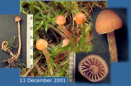 The solitary Buttercup is still hanging on, so I thought another picture was needed to record it. As you can see, the second bud (to the right) is still tightly closed. Much of the day I have been doing some painting and other jobs under the caravan cover. For a lot of the time this morning I worked to the combined choirs of the sparrows in the Hawthorn and the Ivy tree. I wonder why they keep up this chirping for such long periods of time. Surprisingly the noise did not attract the attentions of the Sparrowhawk and I did not see it at all today. I have recorded a short sample of the Sparrows' 'singing'. It is a wave file of 171KB and you can download it by clicking here. 8 December - Another nice day with very little activity in the garden. However, there was more digging in the garden last night with no camera set up! This time there are three 'digs' by the small pond - I have set up the CCTV camera to watch over the area tonight. I am certain that it is the work of a fox, although even with foxes coming into the garden for many years this had never happened before. At 6.30pm there was a single Cabbage Moth caterpillar out on the grass in an air temperature of <1C. 12 December - When I was checking the pond tonight I noticed several very small fungi fruiting bodies in the area where the caterpillars have been (they were not to be seen tonight). I shall take some photographs tomorrow. Over the last few days I have been busy doing other things and have not spent time watching the garden. Bird activities to note include a flock of swans that flew over, very low - I have not seen that here for a long time. They sound as though their wings need oiling! There were Long-tailed Tits about today, and the Dunnock has become a regular again. The fox(?) has been doing a little bit of digging since my last report and I have set the CCTV camera up again tonight to see if I can catch it in action. 13 December - An interesting start to the day this morning. I have just been chopping up some peanuts in a food processor (the Dunnocks and Robins appreciate these) and when I stepped outside my back door I disturbed a Goldcrest in our Christmas tree (Scots Pine - 4ft high in a pot!). I retreated quickly and when I looked out through a window the Goldcrest returned and I realised there was a second one still in the tree! As I write this they are now hunting in the lower parts of the bamboo plant by my workshop shed. When they departed I went out to scatter some of the peanuts and was greeted by a pair of robins. As soon as I threw down some of the peanut bits one Robin went down, took some and flew to the other, which begged to be fed - a bit of bonding going on here! I must buy some mealworms. On the down side, I have gone through last night's videos. Eight hours of recording revealed nothing - not even a cat! The videos will be recording again tonight.