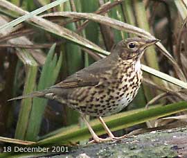 18 December - I am not able to pay too much attention to things in the garden at the moment and it is really looking pretty sorry for itself. The weather is cold, staying within a few degrees of freezing much of the time, although we are not seeing much in the way of frosts. The last two mornings have seen visits from a Song Thrush. It was out of reach of the digital camera, but I have taken some pictures this morning using my T90 camera. The light was not good so I must keep my fingers crossed that it stayed still for long enough as the pictures were taken.