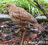in the air, the female The daytime temperature has struggled to get above 1C all day and we have had periods of wet snow. Activity in the garden has been at a minimum, although we have had a visit from the sparrowhawk who could not find anything to catch. A song thrush has been down by the hawthorn eating several worms this afternoon and a couple of female chaffinches have been here several times. 21st - A slightly less cold (6C) and dry day has not seen a great increase in activity today. However, I spent quite a while watching a pair of song thrushes hunting worms between the hawthorn and the house. Poor light made it difficult to get a good photo opportunity. They are very wary of any movement that I make even with me inside the house.