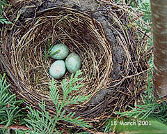 She has built a nest just under the tree canopy, completely hidden from above. In it I found three eggs - this explains her loss of weight.
