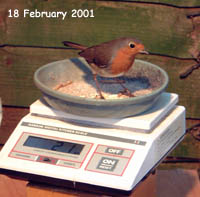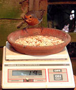 on weight (now 23-24g). The male 26th - The female blackbird weighed 100-101g today 27th - Four song thrushes spent time in the garden this morning. there was displaying and a brief fight between two of them. They fed on ivy berries. There is a good number of sparrows here in the daytime now, 30+ today. Saw a goldcrest at the bottom of the garden. 28th - Three long tailed tits spent time here this morning, feeding on a fat ball in the hawthorn. Two returned in the afternoon. Watched as a wren hunted for food below the hawthorn and among iris plants in pond. The female blackbird weighs 105g today, and the female robin is 25g.