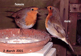 2nd - At last I managed to get a photograph of the robin pair together. Unfortunately, whlie the female is calling for food, the male had not got round to picking up a mealworm. Usually the feeding takes place away from the dish. 3rd - Watched a goldcrest hunting in the burberis bush. Saw a dunnock in the garden for the first time since Christmas.