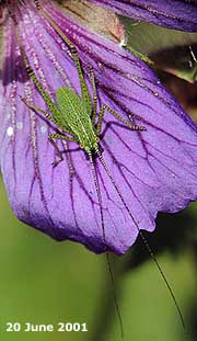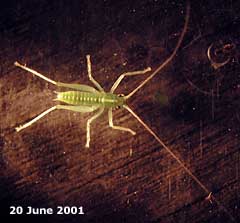 On the next leaf was this young cricket which is different to the ones I have already been watching. This one is about 7mm long and has shorter antennae in relation to its body. I shall have to watch out for it in daylight.