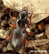 This ground beetle was spotted yesterday as it moved about in the undergrowth. My books suggest that it is a Pterostichus madidus.
