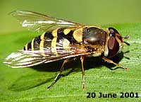 This Hover fly was having breakfast on the Bamboo leaves. The meal was the sticky deposits provided by the aphids. My Collins guides suggest that it is very similar to Syrphus ribesii.