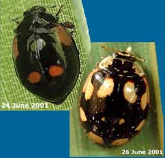 Here are a couple of ladybird variants spotted on the bamboo in the last couple of days. The first one, with the red spots, is a black version of a Two-spot Ladybird. The second one is not matched in my insect book, but my guess is that it is a variant of a Ten-spot Ladybird. Notice the little flashes of red at the front of the large spots and at the sides.