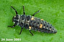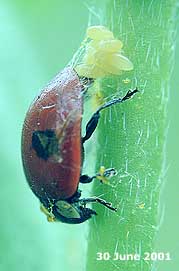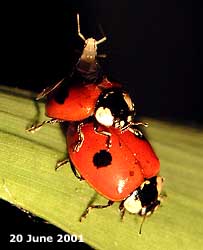 Tonight a quick check down the garden with headlamp on revealed this pair of mating ladybirds on the bamboo plant, with an aphid taking a close interest in the proceedings.
