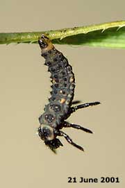 Today it is quite windy so not a good day for quick pictures of the small beasts in the garden. However, I spotted this Two-spot Ladybird laying eggs, head-down on the stem of a Water Forget-me-not. Has she walked through a web before starting to lay or has she produced the threads as part of the process? |