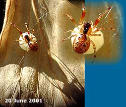 This spider was spotted this morning on a dead Ivy leaf among the Stinging Nettles. It was busy spinning a silk framework over its egg case which measured about 3mm across. A look in my Larousse Guide to Spiders did not come up with a similar spider - some more searching needed for this one. While the female blackbird continues to sit on her nest, the Blue Tit parents seem to be far less ready to feed their offspring now. There has been a lot less activity at the feeder even though the juveniles are still calling for food and flying to the area around the feeder.