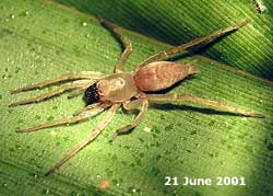 This spider was 'captured by torchlight tonight, among the sticky spots of aphid deposits. The spider's body is about 8mm long. A look in my Larousse guide gives Clubiona pallidula as a possible indentification for it.