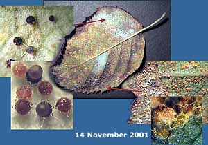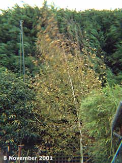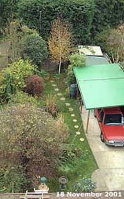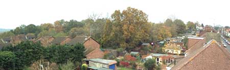 The white areas seem to be a mat of white filaments. Scattered over this mat are small spherical fruiting bodies (0.25-0.3mm diameter)which range from white to black in colour. The black bodies have straight filaments radiating out from them. The base of each filament seems to be swollen, or surounded by a drop of liquid (?- there has been no sign of this evaporating after the leaf has been in a warm room). Click on the image for a larger version. Delving into an old botany textbook I came up with a clue as to what these structures may be. In a chapter on Mildews and moulds. It showed a diagram of a perithecium - a spherical reproductive structure formed by a mass of hyphae which aggregate into a tiny ball, anything from 0.05-0.3mm in diameter. The filaments that radiate out from it are single-celled out-growths that have different shapes in different genera. A set of comparative diagrams narrows the one in the photograph to Phyllactinia. Species of this genus cause a powdery mildew in various trees, including Birch - it may well be Phyllactinia guttata! Here is one website that includes a couple of photographs of the Genus - If you select this link it will open in a new window which may hide this one! The site uses the word cleistothecia (rather than perithecia) which seems to be a more specific term for the spheres. http://www.cals.ncsu.edu/course/pp318/profiles/pm/Phyllactinia.html Bird activity has been generally low although there have been a few things to note. On Monday I saw a Song Thrush spend a bit of time at the bottom of the garden. Yesterday, we had a visit by some 30+ Starlings, something that used to be a regular occurence. A male Blackbird spent the best part of an hour perched in the heart of the Hawthorn, although I did not see it go down to the ground to feed - perhaps we will gain a replacement for the pair we lost at the end of the Summer. I mentioned a Wood Pigeon in my last diary entry and on Tuesday we had three here. One of them spent time in the Hawthorn picking off haws and eating them -the first time I have seen them doing this. Unfortunately as I moved to take a photograph it flew off. 18 November - This weekend I had to head for the roof-top to deal with a damaged TV antenna. It has given me a rare chance to get a 'bird's eye' view of the garden and the neighbourhood. The right-hand picture is looking North towards the top of our road (and the top of the hill). The trees beyond the houses mark the position of the Brickfields Country Park - a wildlife sanctuary hemmed in by the spread of housing developments. As the pictures show, there