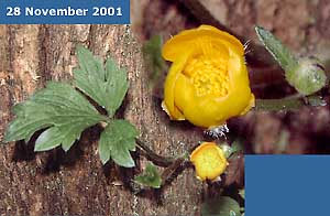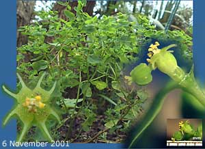 The flowers are in fact an inflorescence with a single female and several male flowers. The inflorescence is surounded by four modified leaves (bracts) that give the impression of being green petals. To take the right hand photograph of a 'flower' I cut away a couple of leaves and a milky sap oozed out. This liquid contains a poison called euphorbone.