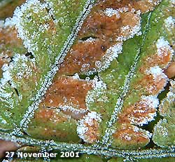 9 November - No pictures today but a couple of things to record. There was no repeat of yesterday's wintery blast but it has remained cold all day. The bird-bath was iced over for the first time this morning. I was out for several hours in the day but while I was here I saw feeding visits by a Goldfinch, Wood Pigeon, Great Tit, Dunnock and Coal Tit (in addition to the 'usuals'). 14 November - In the last couple of days things have been very quiet. It has remained quite cold and last night the bird bath froze over for the second time. As I write this at 10am the Hawthorn is alive with restless sparrows that are enjoying the bright sunshine of a cloudless morning. So far, the only other birds to appear in the garden this morning have been a few Blue Tits, a pair of Great Tits and a Goldfinch (up in the conifers). ! have not noticed any new larger fungi appearing in the garden of late. However close inspection of the leaves left on the Birch tree has come up with a couple of very small types.