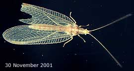 A first look in a field guide suggests that it is an aptly named Winter Moth (Operophtera brumata). if it is, then it is a male as the females are virtually wingless. Their caterpillars are 'loopers', similar to one I photographed on 27 August. The adults begin to emerge after the frosts begin, from mid-October to the end of December. The females run up trees or shrubs and after mating their eggs are laid on buds, hatching out when the buds burst in April/May. 30 November - November is coming to a gloomy, damp and mild end. At 10.30am this morning the temperature is up to 13C. Bird activity has been very limited so far. However, the Blackbird pair have spent a long time perched in the Hawthorn, eating haws and giving me this chance to picture the male. This image shows a white patch on the bird's left side. His right side does not have any marks that I can see. Earlier, when we had 5 Collared Doves about, there was a bit of agressive displaying going on between them. And before I forget, It looks like the Buttercup will see its way into December, although the second bud shows no sign of opening. One last image to squeeze into this month. This rather battered lacewing is resting on the window just to my right as I type this at 10pm - another creature tempted out by the continuing mild conditions. the outside thermometer has remained on 13C ever since this morning. |