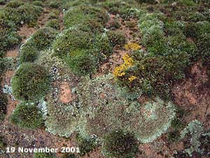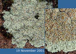 This is a ridge tile, well populated with a mixture of mosses and lichens. Below the ridge the population density drops quickly, so that by half way down the surface looks more like the picture above. The level of moss growth is controlled by bird activity. When there are Starlings about we often need to sweep away the moss bombs that come tumbling down from the roof! On the bit of roof accessible from my roof ladder, there seem to be two sorts of lichen, the Xanthoria (above) and this one, which I think may be Lecanora muralis, which is common on nutrient-rich roofs,rocks etc. The largest growths I could see were about 15-16cm across.