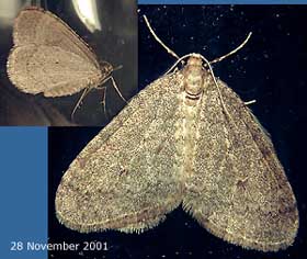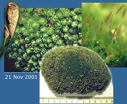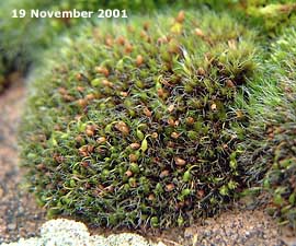Here are some pictures of another moss growing on the roof. It grows into tightly packed, dome shapes like the one shown, which measures about 12x8x4cm. Unlike the one pictured yesterday, there are few spore capsules present, standing about 1cm above the surface. There are a number of new(?) growths which are pictured at the right. I guess that these may be developing spore capsules. This moss seems to be pretty common on the rooftops around here, but I cannot come up with an ID for it yet. Click on the image to see a larger version. Just one bird note for the day. Walking back up the garden for a break from the pruning I had a close encounter with a Sparrowhawk that was crossing the garden at about my nose level - its wing clipped me as it passed with a 'whooshing' sound. I should also note that the Coal Tit is now a regular visitor to the feeder. 22 November - I was away from home most of today, but something worth noting is that this morning both male and female Blackbirds came to the Hawthorn to eat some haws. They are spending a lot of time in the garden now. With a bit of luck they are becoming replacements for the pair we lost earlier in the year. There are pairs of Great Tits and Chaffinches about more frequently at the moment. I should have said yesterday about the biggest flock of Starlings down in the garden for a long time, perhaps 20+. We have had a lot more, but not in the last couple of years. The Cormorant went over again. 23 November - This week the leaf fall on the Hawthorn and the Birch is almost complete and I can now see through both trees. The opening to the Blue Tit box is now visible from the house. At 10.30am I have just seen a Wren in the garden for the first time since April. It spent time hunting in the plants just out side the window. A Wood Pigeon has been sampling haws again. It finds it quite a challenge as the outer branches of the Hawthorn bow down under its weight so that it can snatch only one or two before losing its balance and 'falling' out of the tree. This afternoon I spotted a Goldcrest in the Leylandii, and the Sparrowhawk paid another visit - unsuccessful (I think).