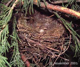 This morning we have had visits from a Dunnock, a Greenfinch and a couple of Goldfinches. The Sparrowhawk has made another half-hearted attack on the Sparrows, spending some time looking down on the garden from the conifers before leaving. Yesterday I spent some time watching the Blackbird female tearing apart the nest that was built in the Hawthorn by our previous Blackbirds. Was she just looking for food, or did the action have some other purpose? Talking of nests, Greenfinches are the most likely candidates for builders of the nests I found in the Leylandii last week. Another look at the nests revealed that fine roots were used in the linings (I originally took them to be just dried grass).