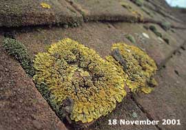 the time. Although I did not spend too much time looking at details, the roof provides a very different environment to the rest of the garden below. The gritty, concrete tiles provide a good surface for lichen, while the junctions between them are favoured by the mosses. I think the lichen shown here may be Xanthoria parietina which favours places where there is nitrogen enrichment by bird droppings. I have to go back up tomorrow. Perhaps I will have time to take a closer look at what else might grow up there.
