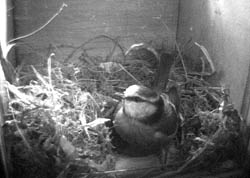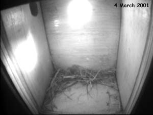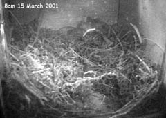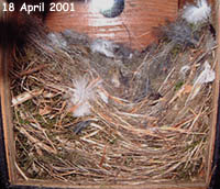 were made this morning but I have seen none since lunch. Sunday 25 March - A maximum temperature of about 6C and still we wait - and we changed to British Summer Time today! The female still makes a few morning visits. When I look back at last year's diary, nest building is still ahead of schedule, although by now last year she was roosting in the box. Serious nest building was under way by the end of the month in 2000 with the final 'soft' upholstery being added at the start of April. Patience (and optimism) is a necessary virtue. Tuesday 27 March - Hardly any visits in the last two days, although I did see a little bit of nesting material go in yesterday morning. The weather forecasters are promising a bit of spring after this weekend. Thursday 29 March - The last couple of days have been