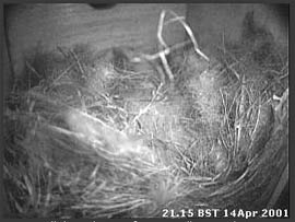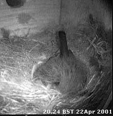 21 April - The day saw a number of visits, mostly in the morning during which only small amounts of nesting material was brought in. Most of the visits seem to have been inspection visits. She would enter the box, usually settle briefly in the nest cup, do a bit of rearranging and then leave. At 7.07pm she entered the box and immediately settled down somewhat restlessly. After about 10 minutes she left the box briefly before returning to spend another 27 minutes snuggled down in the nest cup, only to leave abruptly at about 7.45pm.