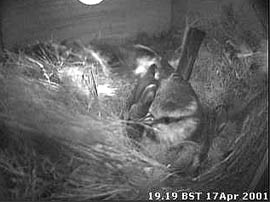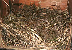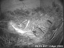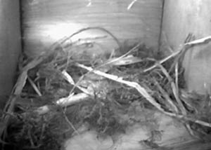 the nest with softer bedding. At 7.45pm she was not in the nest and I could see no sign of eggs. 15 April - No sign of eggs and the nest is still empty at night. These two images show that there has been some activity over the last two days, although there has been very little added. 16 April - Back home today! I have seen the female
