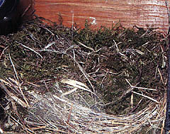 Wednesday March 14 - Nest building continues with enthusiasm today. A pattern is starting to emerge, with the female regularly clearing the material from the area that she is pictured in here. I assume that this will be the eventual position of the nest cup. Since this image was captured she has started to bring in more moss and other fine bits so that the coarse material is gradually being hidden. |