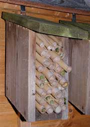 Having taken the close-ups of the leaf-cutter bees in action I am including this picture of one of the sets of bamboo tubes being used by them. They are mounted on the North side of the garden fence, just over 4ft from the ground.