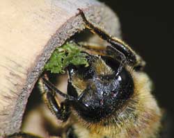 I have managed to ambush a Leaf-cutter bee as it collected pollen and nectar from a Ragwort plant. You can see how the hairs under its abdomen have become a mass of pollen as they are rubbed against the stamens of the flowers. Having lined part of the bamboo tube with leaves, the pollen and nectar will be used to make 'bee bread' on which she will lay a single egg. It will then be sealed in by more leaves before another cell is constructed in front of it.