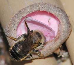 While other bees were going off in all directions to collect pollen or leaves, the one pictured here simply flew less than a foot to a Pyracanthus plant for its leaves. The picture shows it chewing the edge of the leaf before sticking it to the sides of the tube. It is obvious that sometimes the chosen leaf does not develop the correct level of 'stickyness' as some are discarded and replacements collected to continue the task. Looking around the garden I have seen the results of leaf-cutter efforts on the leaves of not just roses and the Pyracanthus, but also the small Willow tree, Buddlea and even the Bamboos (only a few attempts on this!). While most of the time leaves are used to seal the cells, this bee obviously wanted to be noticed as it kept on bringing pink petal pieces. They must have been more fragile than the leaves - the ground has a scattering of pink as a result of discarded fragments. I still have to get a decent image of one of the bees returning with a load of pollen, thickly deposited on the hairs below their abdomens.