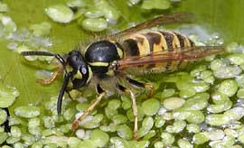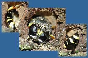 The bamboo tubes that were used for the first time last year are receiving a great deal of attention and much of the activity has been taking place right in front of us as we relax on our deck. The bees are probably Megachile centuncularis, the most common of the leaf-cutters. When a bee has selected a suitable leaf she clings to the edge using mainly her legs. Then, using her jaws like a scissors she cuts the disc, measuring 10-12mm across, in just a couple of seconds and folds it over as she cuts. The lower image shows a tube that is already filled and sealed. Looking back at last year's diary I see that their activities were spotted on our return from Cornwall on the 21 August - perhaps I need a webcam to check on them while I am still away! The log in the pond is the venue for more nest building, this time by a solitary digger wasp. the pile of 'chippings' below the hole (about 6mm across) showed that it's efforts had started before our return, It was very busy this afternoon, and I was surprised to see it busy at 11pm last night. I have not been able to capture an image of it out in the open as yet, but these three images give a general idea of its appearance. It looks as though it could be a species similar to Ectemnius cephalotes.