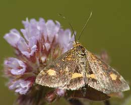 A frequent sight through the summer is the visit of wasps visiting the pond to drink. Their visits are brief and for once I was there with my camera. As this one flew off there was a glint of sunshine from a drop of water suspended under the head. Was it taking water back to the nest? I still see the wasps hunting amonst the plants, but they have now started to take more interest in sweet things as Summer draws on. Another pond related picture taken moments after the wasp left, this small moth was drinking the nectar produced by a flower of the mint plant. Again, my guide books seem to have missed this one out!