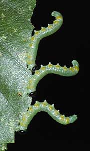 Tonight I spotted the return of saw-fly larvae to the Birch tree, for the third year running. A check of the tree uncovered just one small branch affected with 12 individuals seen. These look similar to the sawflies that I saw on the Birch last year, but they do not have any black markings. John Grearson(of Ashton Keynes), who has a special interest in sawflies thinks that they could be members of the genus Nematus. The picture shows their characteristic tail-raising response when disturbed
