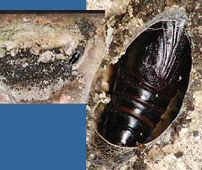 The dark deposits in the picture are made up of the droppings and remains of woodlice that also used the enclosed space. It would appear that the caterpillar blocked the entrance when it decided to pick that spot to pupate.
