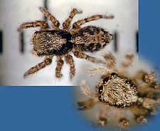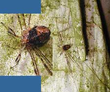 The smaller image shows it with its 'head' reared up, showing its front set of four large eyes more clearly. This second image shows its underside. I have not yet been able to identify it beyond it being a member of the Salticidae -the hunting spiders. Tonight the mist has descended and outside is very damp, although not so cold at 6C. A walk down the garden was rewarded by the sight of this harvestman on the trunk of the Birch tree. It is a Dicranopalpus ramosus, a Mediteranean species which has been spreading across the southern UK. The right-hand image covers an area measuring about 7cm tall.