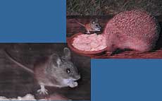 They did not feed at the same time, but I have 'put' the mouse into the hedgehog picture to give an idea of their relative sizes (the dish is 15cm across). In the evenings I use a red lamp to illuminate the area of garden nearest the house and the pictures were taken using flash at very slow shutter speeds, which help explain the red 'shadows' you may see around the hedgehog.