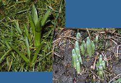 26 December - Boxing Day - A relatively quiet day at home, and the weather has been disappointingly dull and damp after yesterday's dryness. The wet Autumn and winter(so far) has left the ground saturated. I have to be careful when I spend time near the pond because it is far too easy to leave a deep impression in the ground when you spend too long in one spot as the clay soil is so easily squeezed aside. I also need to take care now as next Spring's plants are now starting to show themselves. In the last couple of days the Snowdrops have appeared in the area between the Hawthorn and the small pond. There are lots of small shoots there, the tallest being about 3cm at the moment. They seem to be about 5-6 days earlier this time. There are also Bluebell plants pushing up, including the two shown in the left-hand picture, which are already about 9-10cm tall.