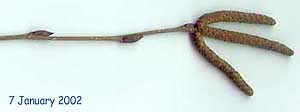 7 January - A dull, damp, and cold day with a lunchtime temperature of just under 6C. I have decided to set up a separate diary to cover the bird box from now on. I have included all the pictures shown above in its introduction, although I will not remove them from this diary. The fox has been digging again by the small pond. I have just been tidying up the feeding area under the hawthorn, accompanied by the sub-song of our male Robin as he took a close interest inwhat was being done. I used the hoe to turn over some of the soil to reveal lots of small earthworms. Surprisingly, the Robin prefered the crushed peanuts and would every-so-often fly down to take a piece before continuing his singing. I tried recording some of it but, unfortunately a Chinook helicopter provided a rather distracting rhythm in the backround. ![]() Here is a branch tip from the Birch tree by the bird box. In addition to the buds along the branches, many now terminate in the large, pendulus male catkins.