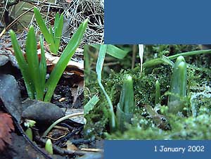 These are two images that I took yesterday of some of the plants that will flower during the Spring. On the left are Bluebell plants at the bottom of the garden, and on the right, Snowdrops popping up under the Hawthorn.