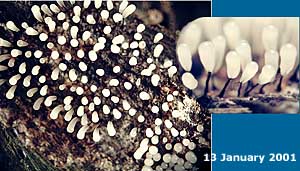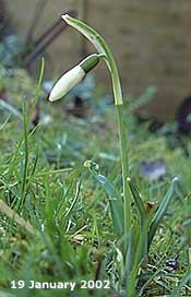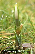 The small structures are about 5mm long - the black, 3mm long stalk is topped by a white slimy head which is almost 'light bulb' shaped. This sticks to anything that touches it, leaving the stalk behind. I spotted similar growths some years ago and failed to identify them at the time. I must make another effort this time. 14 January - I spent some time doing some clearing around the ponds. I cut away the remains of last year's Red Campion flower stalks and as I cleared bits off the ground I spotted the first of our Daffodils pushing up out of the ground. 15 January - Due a serious illness in the family my diary is likely to be neglected for much of the next week or so. 18 January - Sadly, the family has suffered a sad loss, so there will be no further diary entries until at least next weekend. 19 January - A pause to rest allows me to make a short entry for today. First pictured on the 13th, our first Snowdrop has taken its next step towards flowering as the flower head drops down from the sheath that protected it. This individual is quite a bit ahead of the rest at the moment, with some having reached the stage of the previous picture and a lot still only just above ground level. The male Robin is happily taking mealworms this breezy, sunny morning (8C at 11.45am). Although the female is about he is not interested in feeding her at the moment. The Dunnock is about nearly all the time but I have not seen the Song Thrush since the beginning of the week. 28 January - Returned home today. I was greeted by the robins who were both happy to see a renewed supply of mealworms. A pair of Dunnocks tucked into the food-processed peanuts. The main feeder was empty, but the peanut feeders are still more than half full (all filled on the 19th). I took the opportunity to clean the feeder and the bird table. No picture yet, but the early Snowdrop flowers have started opening - some have still a bit more to go yet. 30 January - Getting back to some sort of normal life is proving a bit difficult and I am not paying too much attention to the garden at the moment. However, gazing out onto the garden from our bedroom window this morning we were rewarded by the arrival of a Sparrowhawk (a female I think, large with brown plumage). She landed in the Hawthorn and just perched there as a Robin, Blue Tit and several Sparrows seemed to be uncertain whether to stay still or flee. A short game of chess followed as she made several moves from branch to branch. The small birds stayed put in the Hawthorn, moving to the opposite side of the tree each time she moved. She soon gave up, flew briefly to the Ivy tree, where a lot of Sparrow chirping could be heard before flying off empty handed to try her luck elsewhere. |