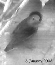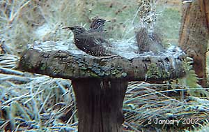 2 January - Another bitterly cold start with the temperature down to -5C just outside the house at 8am with all the greenery in the garden coated with a white layer of frost. All the usual birds have been down to feed. The picture shows a trio of Starlings taking advantage of the only liquid water about. Moments before, a Song Thrush was drinking from there, but left as soon as the Starlings arrived. Just after 9am four Greenfinches came, staying where the sunshine had reached the Birch and the Leylandii. I have only seen one Blue Tit visit to the box so far (up to 9.25am). Down on the ground I have just watched a female House Sparrow having a frantic tussle with an enthusiastic, displaying male. This afternoon there were further Sparrow 'interactions'. I have just watched two males being extremely agressive towards a female that they had almost trapped between branches. While one seemed to concentrate on her head, the other was pecking furiously at her tail end. Feathers literally flew before she was finally left alone. before leaving, both males displayed with wings spread and tail somewhat erect. The female paused for a moment and then flew to the feeder as though nothing had happened. 3 January - A brief entry today. The cold, sunny wether continued today, although the temperature was slightly up on the last few days. A lot of the frost disappeared in the more open areas of the garden. At 9.15pm the temperature is down to -1.3C by the house. One of the highlights of the day was a Song Thrush bathing in the birdbath, and I missed it! I did catch a glimpse of a wren in the Hawthorn. 5 January - The icy spell came to an end late yesterday as the temperature crept up and the frost disappeared. Today started with a balmy 5C and this afternoon reached 8C on a dull, misty and damp day. This weather is really miserable after the bright, sunny days we have been getting through most of the holiday. Bird activity today has been very restricted. All the usuals have been here, plus a Great Tit, but the visits have been far less frequent. During the periods I have been watching, I have seen no visits to the bird box - there were a couple yesterday.