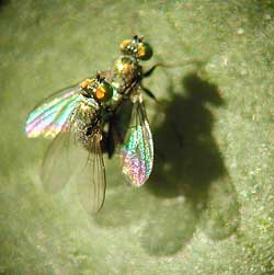Here are a couple of photographs for the record. The first is a large frog-hopper. It is unusual to see one as big as this in the garden, measuring nearly 12mm in length and spotted on the birch tree. A look in my insect guides suggests that it is Aphrophora alni. There are lots of small flies, of numerous types about at the moment and there two were spotted on a geranium leaf, mating in the early morning sunshine. Each fly had a body length of about 3mm. Although the weather was dry and sunny for much of the time I am not seeing visits by insects such as butterflies, damsel-flies or dragonflies. No more crickets appeared, and most of the time I could only see one at the most. |