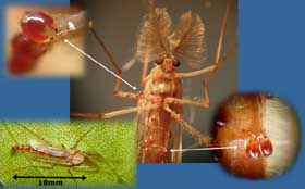 I found a similar midge on a leaf of the birch tree today. After taking its photograph on the leaf I decided to bring it into the house to take some close-ups. When I did, I found that the midge was host to numerous mites (or ticks).