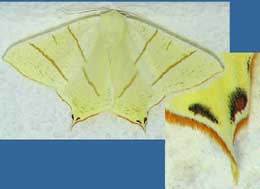 Around 10.30pm our bathroom was the place that this Swallow-tailed Moth (Ourapteryx sambucaria) was spotted. It measured nearly 5cm across and is one of our largest night-time insect visitors. The inset shows details of the hind wing markings, including a tiny red spot.