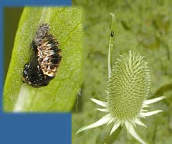 The teasel flower head I pictured in the middle of May has now grown to about 5cm in length, and the ladybird larva pictured last week seems to have decided that the plant is a good place to pupate!