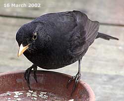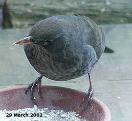18 March - On a very wet morning the female Blackbird is nest building. She is gathering bits from amongst the Irises by the small pond. She headed down into the Leylandii, behind the Ivy tree. In the meantime, her partner was seeing off a juvenile male that had come to feed on the mealworms. The rest of the day was wasted, trying to establish the cause of a hard drive problem on my laptop. The damned thing has to go off to get a new hard drive (under guarantee, fortunately).