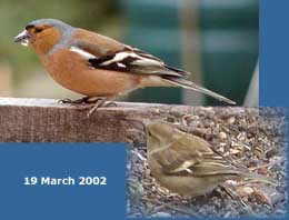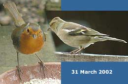 As I write this at 10.26am the male Chaffinch is in the Hawthorn, calling for all his might. A short while ago he and his partner were feeding together on the bird table, and although he left before I could take a picture, the female stayed just long enough for this shot. Both Robins have been feeding at the dish again and the picture is of the female (none of the white feathers that 'our' male has. Click on the picture to see a larger version. |