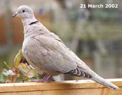 The Collared Doves are regular visitors to the bird table, usually a pair with occasional extras. They seem to want to trust me and I am often allowed to get quite close as I put food for them. Click on the picture to see a larger version.